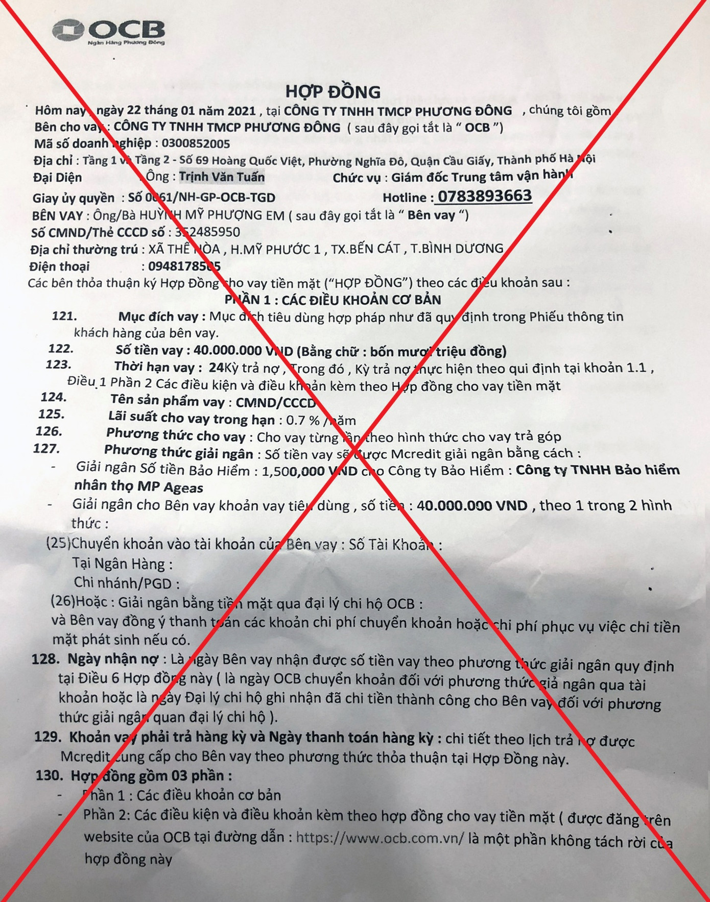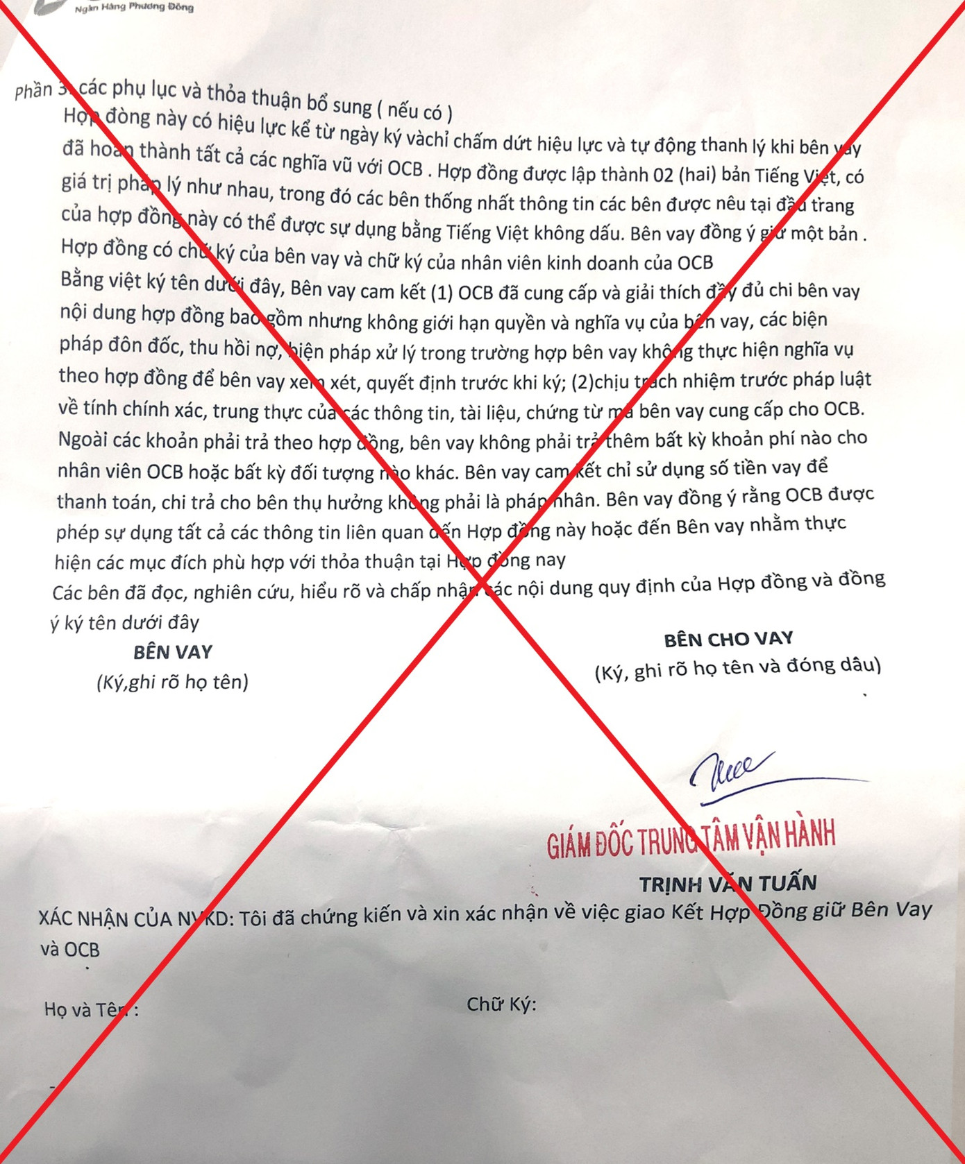 Các đối tượng này đã tìm kiếm khách hàng có nhu cầu vay qua các kênh Facebook, mạng xã hội của các ngân hàng, công ty tài chính…Sau đó, từng bước tiếp cận, tư vấn, chào mời và thực hiện các hành vi lừa đảo. Hồ sơ giả mạo được mô phỏng các điều khoản theo mẫu hợp đồng vay tại OCB. Tuy nhiên, các thông tin về người đứng tên đại diện của ngân hàng đều sai lệch. Khách hàng sau khi cung cấp các thông tin sẽ được yêu cầu thanh toán theo dạng COD (giao hàng thu tiền) thông qua shipper (người giao hàng)/ bưu điện với chi phí từ 1.500.000 – 2.500.000 để nhận hợp đồng vay.