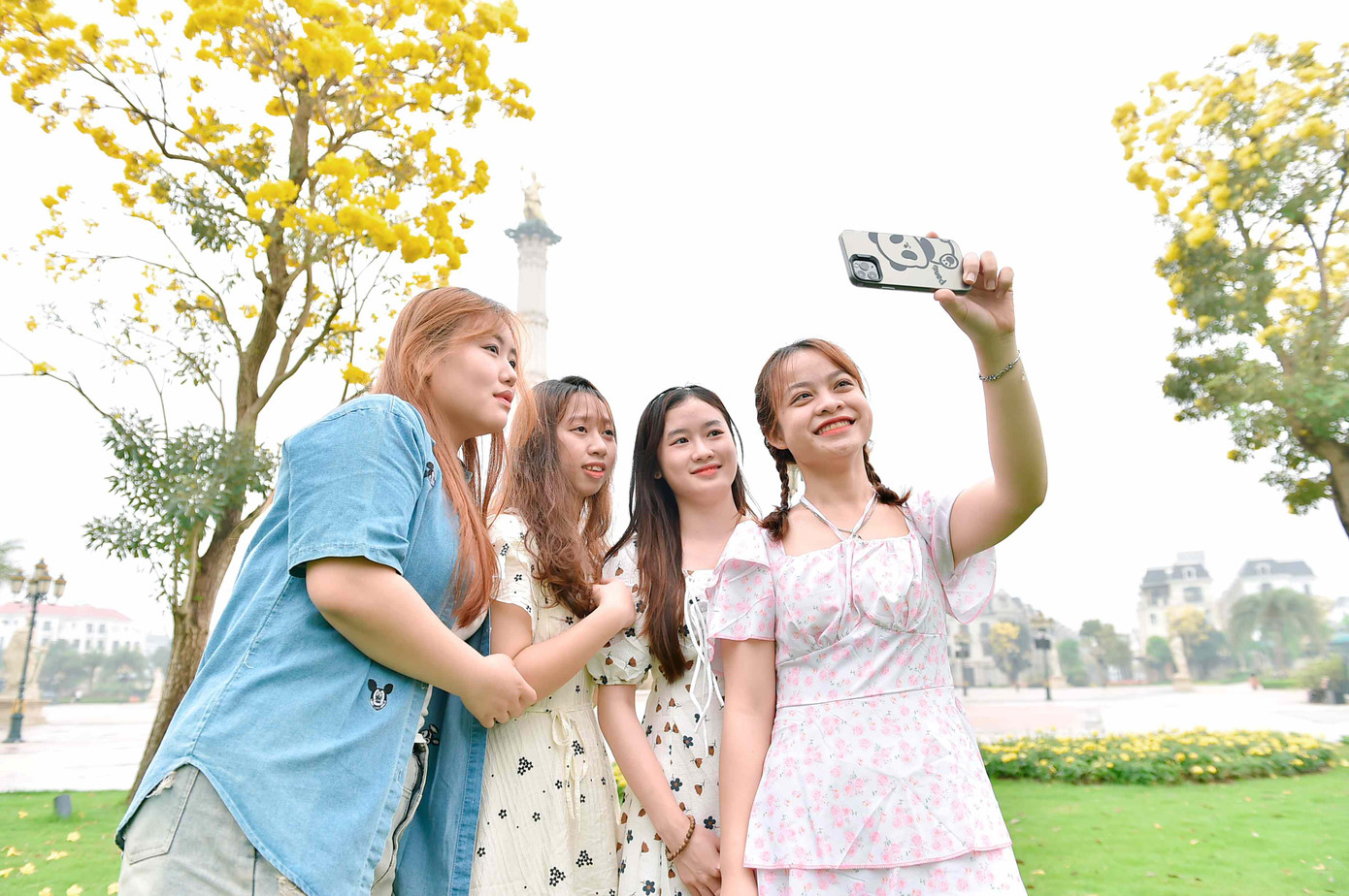 Chạy xe máy vượt hơn 70 cây số từ Thái Bình tới Ocean City, Phạm Thị Hậu và những người bạn của mình đã quên hết mệt mỏi khi bắt gặp mùa hoa phong linh đang ở thời điểm rực rỡ nhất. Thẻ nhớ của những chiếc điện thoại đã nhanh chóng được lấp đầy khi nhóm bạn 4 người “selfie cháy máy” để lưu lại kỷ niệm về một chuyến đi đáng nhớ. “Tới Ocean City vào đúng mùa hoa phong linh thật sự là điều may mắn”, Hậu chia sẻ.