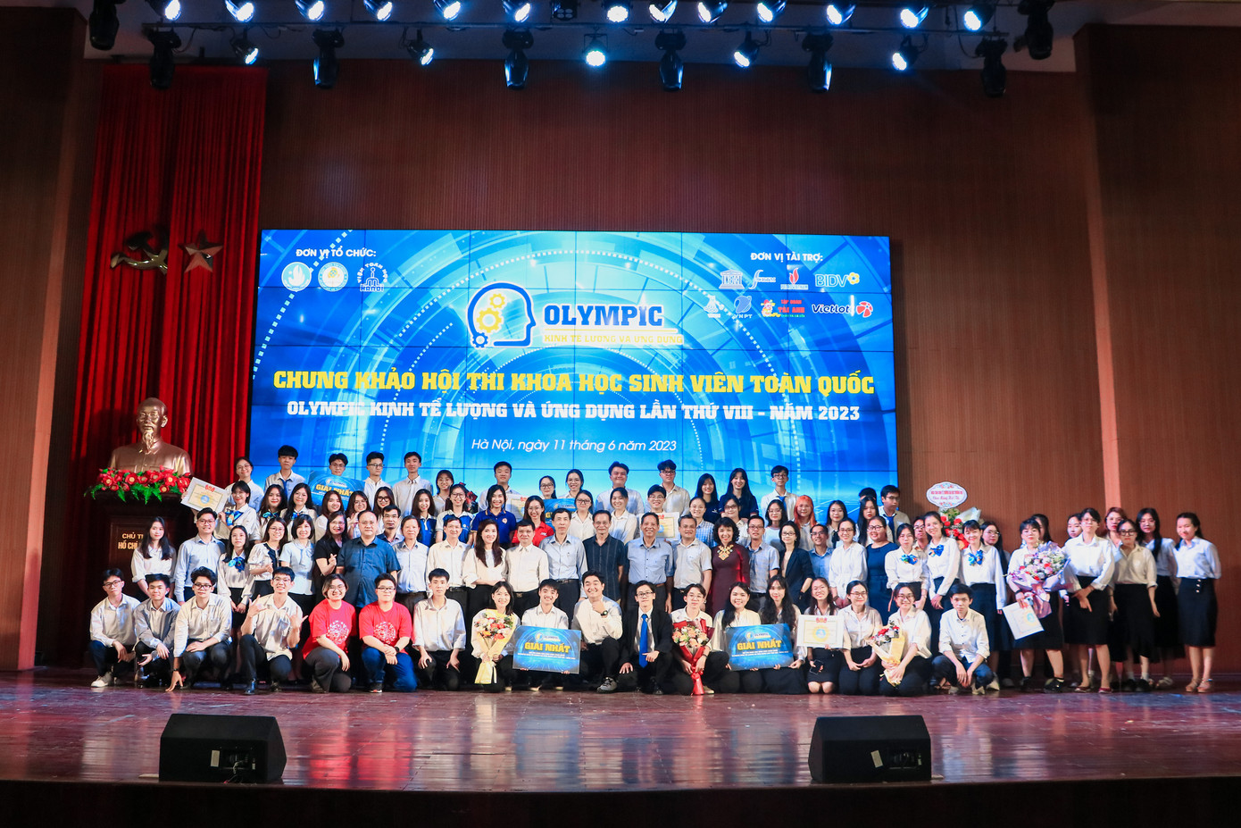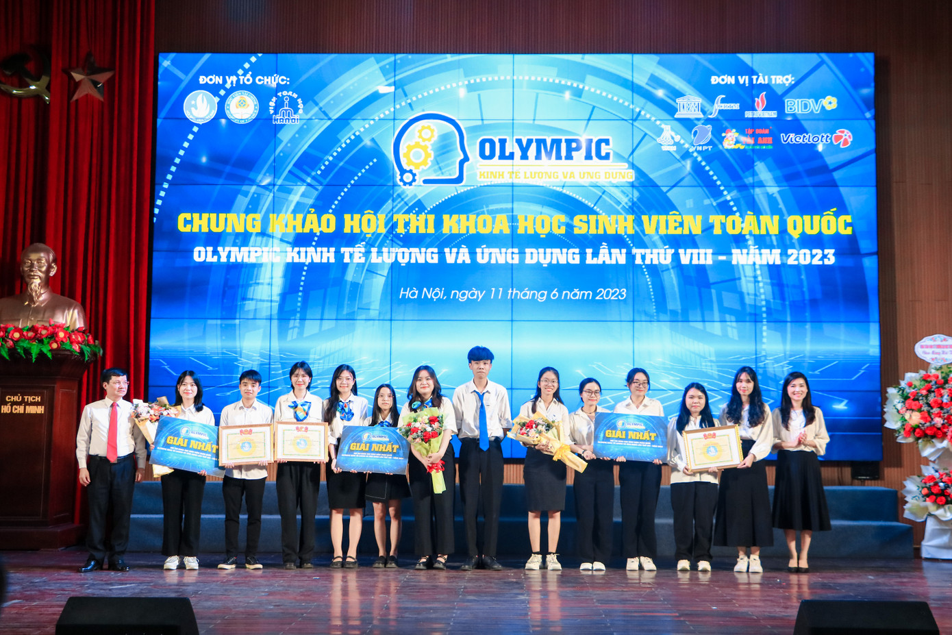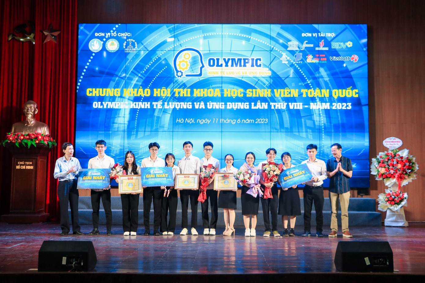 Chung cuộc, 6 đề tài đạt giải nhất Olympic Kinh tế lượng và ứng dụng lần thứ 8 thuộc về nhóm sinh viên các trường: Trường Đại học Kinh tế - Luật – Đại học Quốc gia TP.HCM (Đề tài Dự báo sức khoẻ tài chính của các doanh nghiệp vừa và nhỏ tại Việt Nam: So sánh và giải thích kết quả giữa mô hình cổ điển và mô hình học máy); Trường Đại học Ngoại Thương Cơ sở II tại TP. HCM với 2 đề tài (Do Regulations reduce herding behavior? An empirical analysis in Vietnam và Determinants of staycation intention in the new normal: An extended model of goal-directed behaviour ); Đại học Thuỷ Lợi (Đề tài Nghiên cứu đóng góp của quá trình tái phân bổ đến tăng trưởng năng suất và các nhân tố tác động đến quá trình tái phân bổ tại các doanh nghiệp ngành công nghiệp chế biến chế tạo tại Việt Nam); Trường Đại học Kinh tế TP. HCM (Đề tài Esg anh dividends: The winning combination for savvy stock investors); nhóm sinh viên của trường Đại học Kinh tế Quốc dân và trường Đại học Kinh tế - Đại học quốc gia Hà Nội (Đề tài On the liquidity conectedness between cryptocurrencies anh other financial assets).