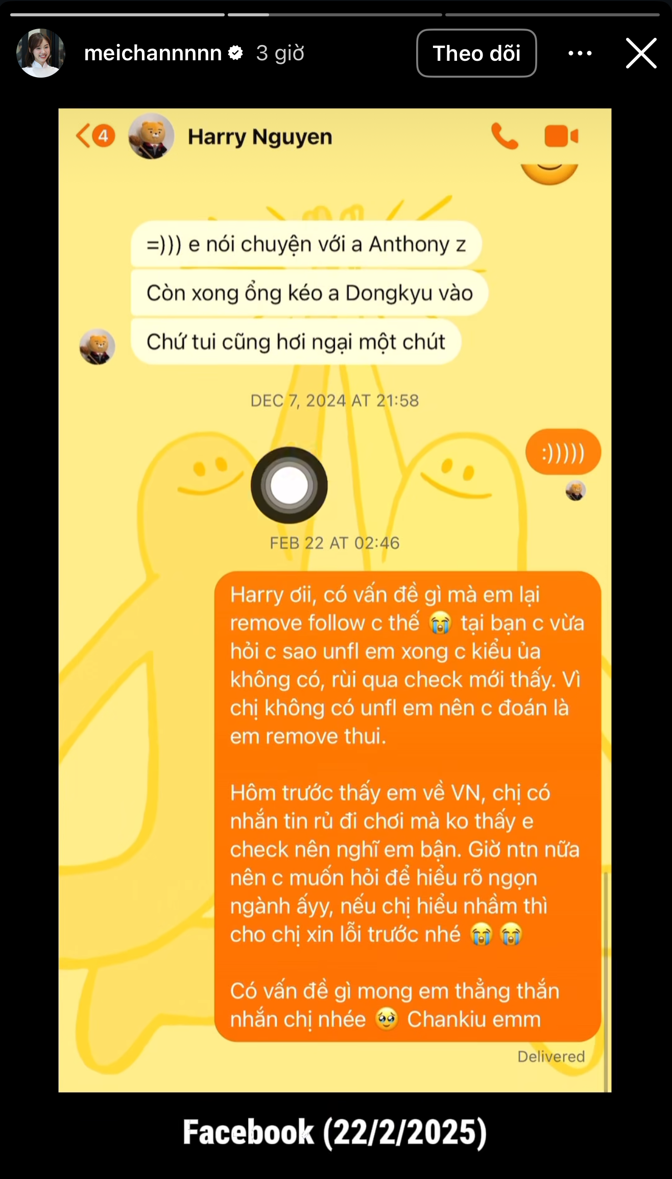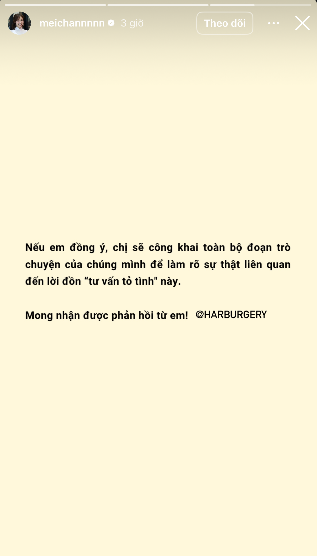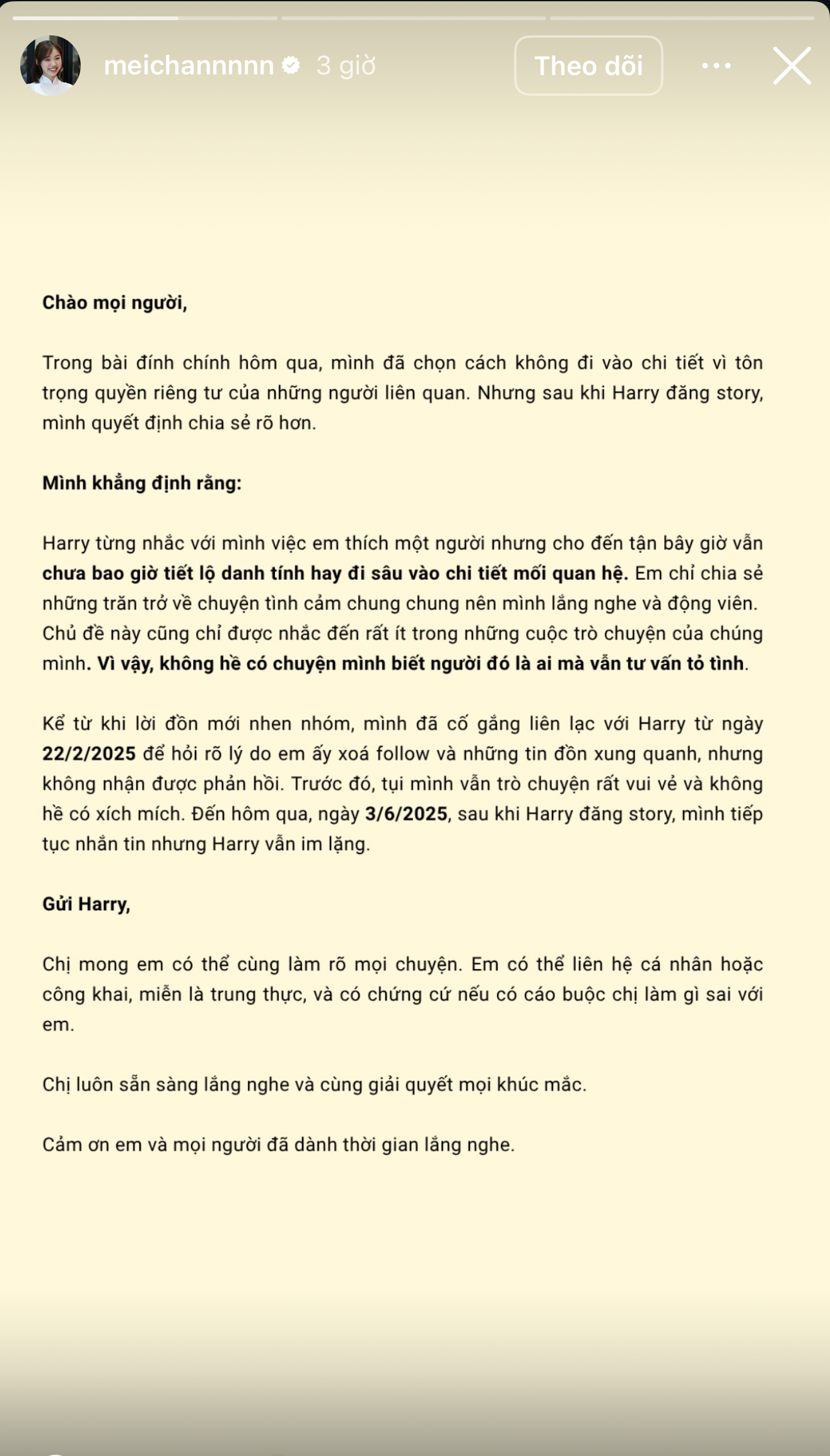 Sau đó, trước sự tấn công từ netizen, Meichan không chọn cách im lặng. Cô nàng đăng bài khẳng định mình không biết người được Harry nhắc đến là ai, đồng thời công khai tin nhắn đã gửi cho Harry với mong muốn giải thích rõ ràng. Tuy nhiên, hiện tại phía Harry vẫn im lặng và không đưa ra phản hồi.