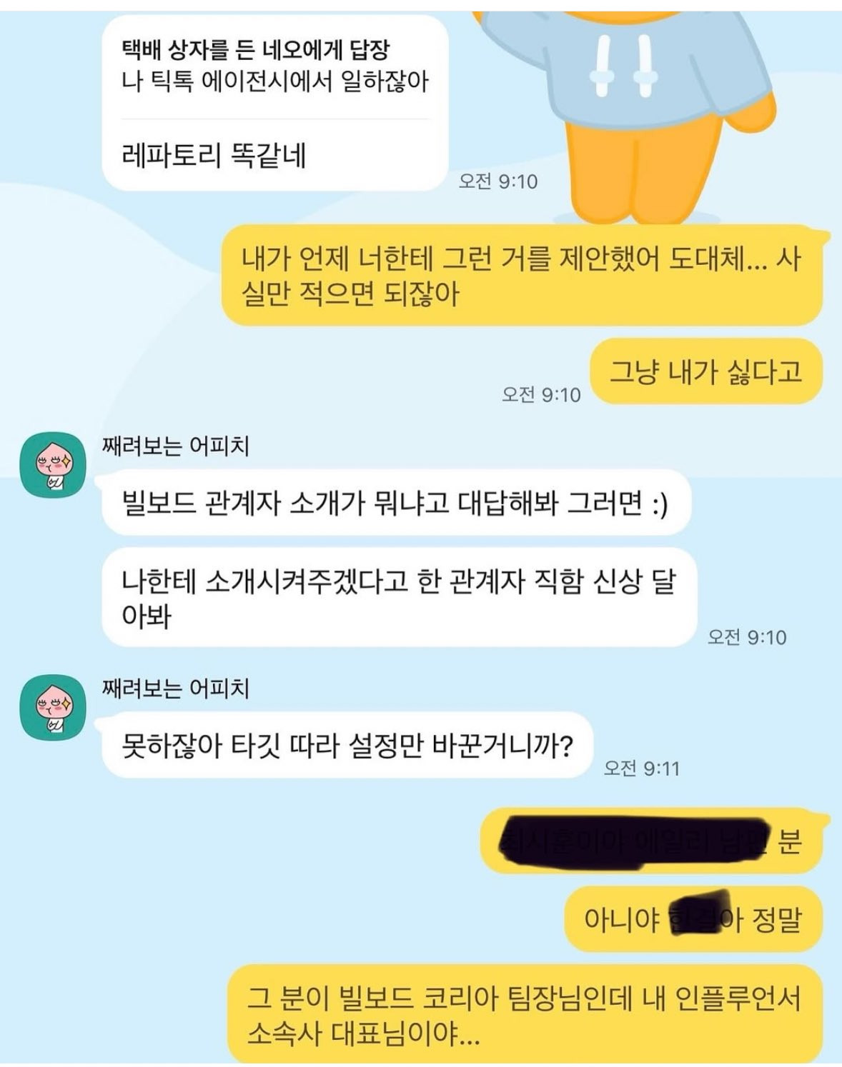 Sau đó, Riwon đã phủ nhận toàn bộ việc mình có ý định xấu xa với Hangyul. Cô đăng thư xin lỗi, kèm theo ảnh chụp màn hình tin nhắn để chứng minh. Trong đoạn hội thoại này, cô có nhắc đến một người đến từ phía Billboard Korea kiêm CEO công ty quản lý người có sức ảnh hưởng (influencer) của cô. Dù đã che tên, một số Knet đã cố tăng sáng để đọc chữ sau lớp bôi đen, nghi cái tên bị che là Choi Si Hun - chồng của Ailee.