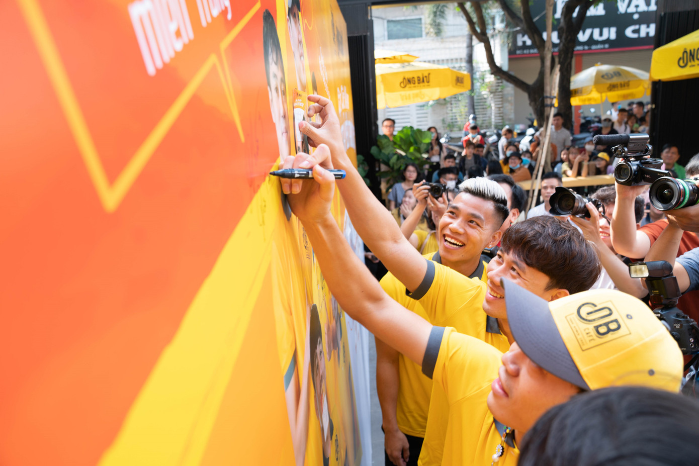 Trong ngày ra mắt quán flagship đầu tiên của hệ thống Ông Bầu, các cầu thủ cũng đã có mặt để chính thức nhận bàn giao sở hữu cũng như giao lưu với các “fan” hâm mộ. Tại buổi giao lưu, với mỗi lời động viên của fan hâm mộ chia sẻ, động viên viết tay dành cho đồng bào miền Trung đang gặp thiên tai, cà phê Ông Bầu sẽ trích 16 nghìn đồng/lời chúc để gây quỹ “Đóng thuyền vượt bão” dành tặng cho đồng bào miền Trung.
