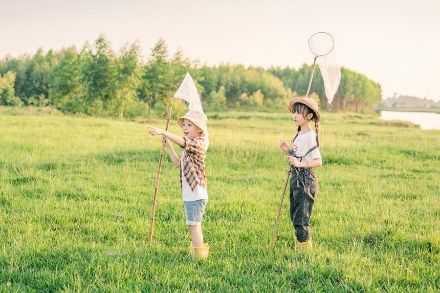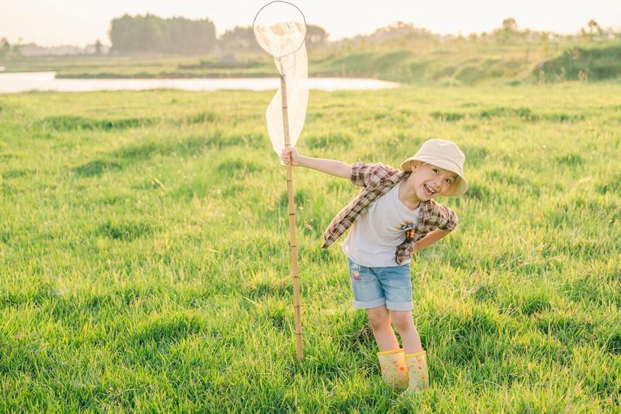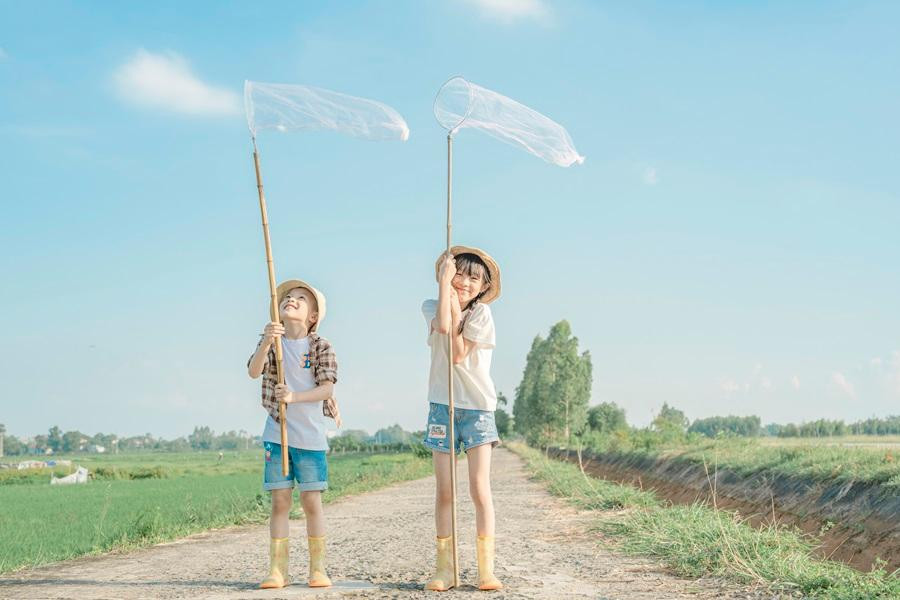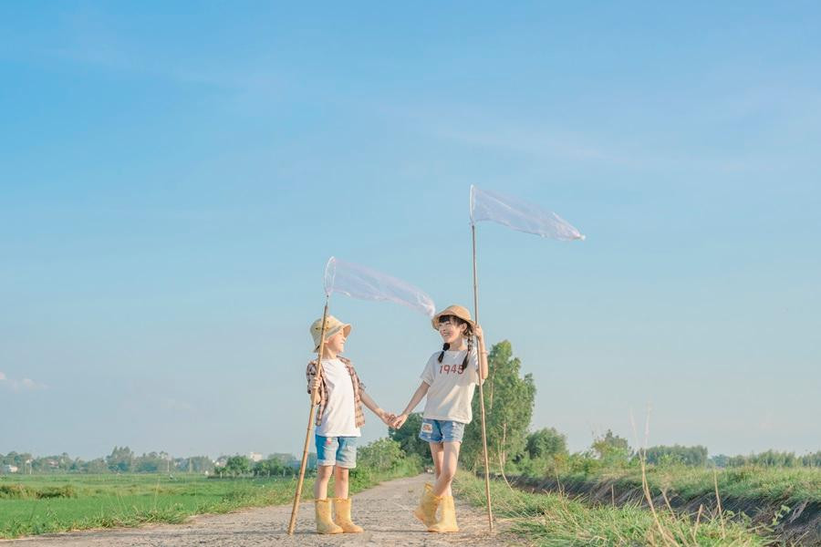 Tuổi thơ gắn liền với những buổi chiều cùng bạn ra đồng bắt châu chấu nên anh Mạnh Tài quyết định mua tre, lưới về tự tay làm vợt cho con. Trên cánh đồng làng quê yên bình, anh chớp lấy những khoảnh khắc chơi đùa rất tự nhiên của hai con. Hai bé rất thích khi được thoải mái chạy nhảy, vui đùa và vợt châu chấu, trải nghiệm với thiên nhiên.