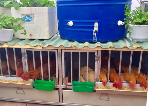 Ngoài vườn rau xanh tốt, anh Tuấn còn dành một khoảng nhỏ trên sân thượng để nuôi gà. Anh cho biết lúc đầu không dám nghĩ đến việc có thể nuôi trên cao, nhưng sau khi tham khảo và đọc rất nhiều các tài liệu về nuôi gà ở nhà phố để đảm bảo vệ sinh, anh quyết định làm chuồng và nuôi.  Lứa gà đầu tiên anh nuôi 15 con cả gà trống và gà đẻ. Sau thời gian chúng bắt đầu đẻ trứng và thu được kha khá, anh để lại một ít đẻ, một ít để gia đình thịt ăn dần.