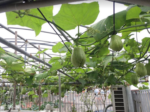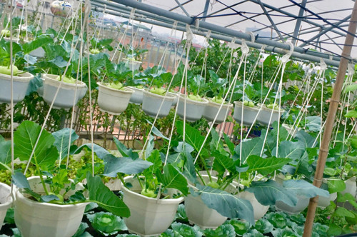 Trên cao, 80 cây su hào được trồng trong các chậu treo theo lối thẳng tắp vui mắt. Củ nào củ đấy đều to, ngon, đủ cho cả dịp Tết và biếu họ hàng. Anh còn trồng thêm nhiều cây ăn quả như dưa hấu, dưa vàng, khế...