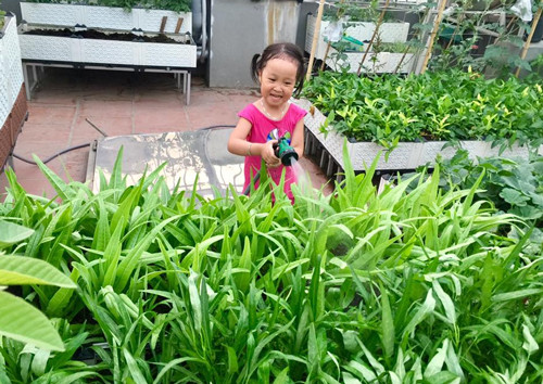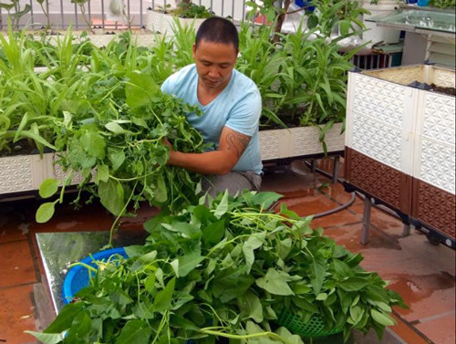 2 năm nay, gia đình anh không phải mua rau ngoài chợ, tất cả đều là thực phẩm sạch từ khu vườn trên cao. Mỗi ngày, anh Tuấn dành khoảng 2 giờ trước và sau khi đi làm để chăm sóc khu vườn.