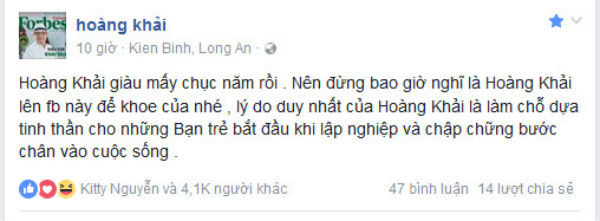 Trên Facebook Hoàng Khải, lượt fan theo dõi vượt mức 130.000, chào ngày mới với câu chào quen thuộc dành cho các fan ruột của mình: “Good morning!”.