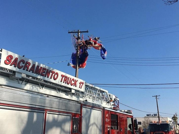 Vì đây không phải là máy bay thật nên “ông già Noel” này không cần đăng ký mà cứ thế lấy ra, gắn dù vào bay. Nhưng trong chuyến bay kỳ lạ đó, cái dù lớn bị mắc vào đường dây điện và “ông già Noel” lơ lửng giữa trời như thế suốt cả tiếng đồng hồ, cho đến khi được lực lượng cứu hỏa giúp.