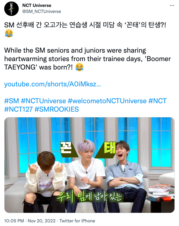 Người hâm mộ không đánh giá cao cách tài khoản Twitter của NCT Universe đã "gán nhãn" thần tượng là “kkontae” (꼰태) bằng tiếng Hàn và “Boomer Taeyong” bằng tiếng Anh. Dù đã cố gắng bỏ qua và cho rằng đây chỉ là một sự "giật tít" vui vẻ, nhưng khi bài đăng được dịch ra tiếng Nhật, Taeyong cũng được miêu tả bằng từ ngữ với ý nghĩa tiêu cực tương tự.