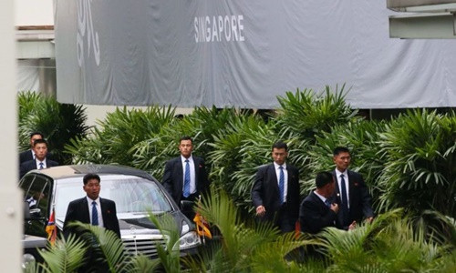 Hình ảnh các vệ sĩ chạy quanh xe hơi nghi chở ông Kim Jong-un tiếp tục xuất hiện chiều nay tại Singapore. Trước đó, ông Kim từng được bảo vệ bởi nhóm vệ sĩ 12 người chạy quanh xe khi tham dự hội nghị liên Triều ngày 27/4 tại làng Bàn Môn Điếm.