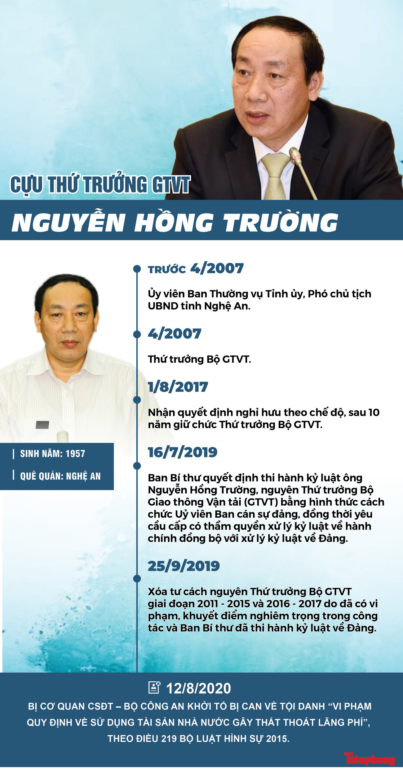 TPO - Sau gần một năm bị kỷ luật xóa tư cách nguyên Thứ trưởng Bộ GTVT, ngày 12/8/2020 ông Nguyễn Hồng Trường đã bị Cơ quan CSĐT Bộ Công an khởi tố, bắt tạm giam về tội“Vi phạm quy định về sử dụng tài sản nhà nước gây thất thoát lãng phí”.