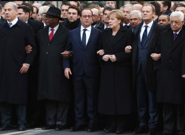 Ngày 11/1, hơn 40 nguyên thủ quốc gia và các nhà lãnh đạo cấp cao từ khắp các nước trên thế giới như: Tổng thống Palestine Mahmoud Abbas, Thủ tướng Đức Angela Merkel, Thủ tướng Anh David Cameron… đã dẫn đầu hàng triệu người tuần hành tại Paris.