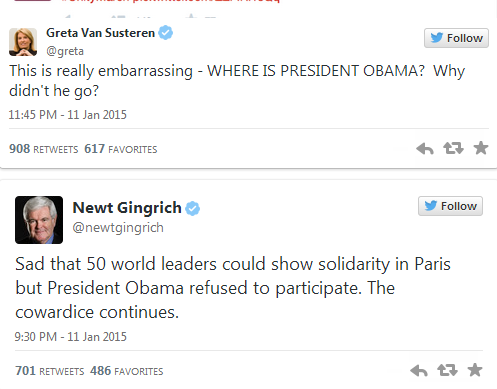 Ông Newt Gingrich, cựu Chủ tịch Hạ viện Mỹ bày tỏ trên Twitter và nói với Dailymail rằng: “thật đáng buồn khi 50 nhà lãnh đạo trên thế giới bày tỏ tình đoàn kết tại Paris mà Tổng thống Obama lại từ chối tham dự”.