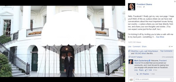 Trong bài đăng (status) đầu tiên của mình, ông Obama đã cho đăng tải một đoạn video nói về vấn đề thay đổi khí hẬu. Ông viết: "Xin chào các bạn Facebook, cuối cùng thì tôi cũng có được tài khoản riêng của mình. Tôi thực sự mong rằng đây sẽ là nơi chúng ta có thể chia sẻ với nhau mọi điều." Đặc biệt ở phần bình luận, 'ông trùm' Facebook Mark Zuckerberg đã trực tiếp gửi lời chào thân ái đến 'người dùng đặc biệt' này.