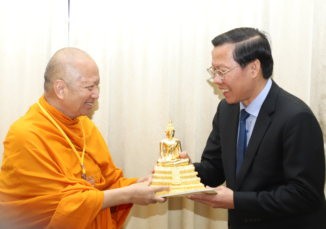 | Chủ tịch Phan Văn Mãi và Hòa thượng Phra Brahmapundit tặng quà lưu niệm. Ảnh: Ngô Tùng |