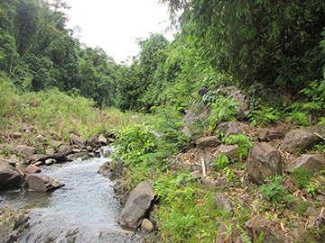 Đoạn đường đến nhà ông Rôm ở thung lũng K- Ruông chừng 7km nhưng phải đi gần 2 giờ đồng hồ. Đến A Đu trong, chúng tôi gửi xe gắn máy lại ở nhà sàn của người bản rồi xắn quần lội suối, ngược thẳng về phía thượng nguồn con suối K- Ruông. Ngót nghét gần 2 giờ đi bộ, phải men theo lau lách, chui qua những khóm dây rừng và rễ cây đan chằng chịch vào nhau.