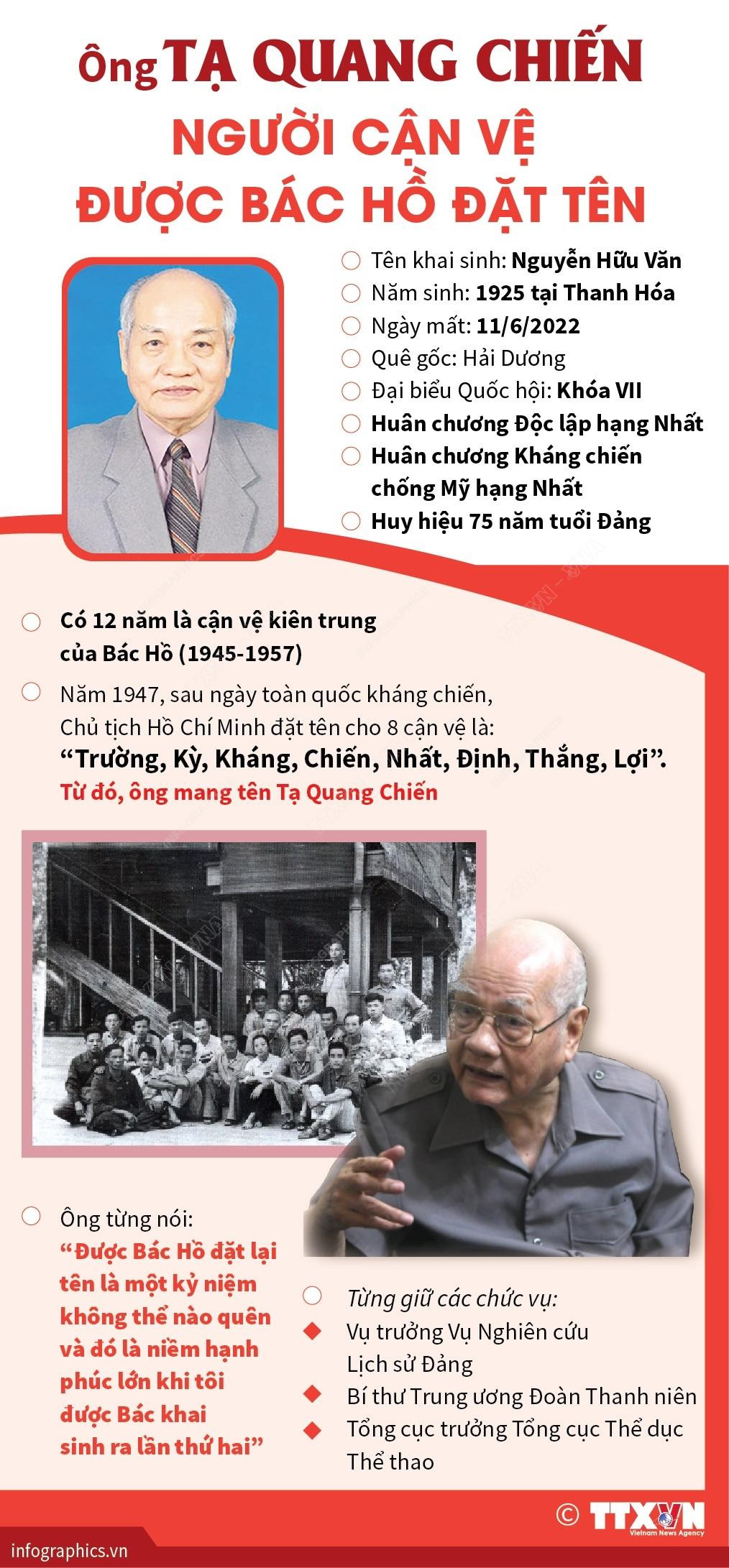 Ông Tạ Quang Chiến, cận vệ được Chủ tịch Hồ Chí Minh đặt tên trong nhóm 8 người “Trường, Kỳ, Kháng, Chiến, Nhất, Định, Thắng, Lợi” đã qua đời ngày 11/6/2022, hưởng thọ 98 tuổi. Tang lễ ông Tạ Quang Chiến được tổ chức sáng ngày 14/6/2022 tại Nhà tang lễ Quốc gia, số 5 Trần Thánh Tông (Hà Nội).