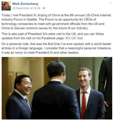 Zuckerberg được ngồi cùng bàn lãnh đạo với Tổng thống Mỹ Barack Obama, ông Tập Cận Bình và Phu nhân Bành Lệ Viện trong bữa tiệc có sự góp mặt của nhiều nhân vật nổi bật trong ngành truyền thông và công nghệ Mỹ.