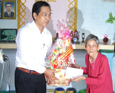 Phó Chủ tịch UBND tỉnh Cà Mau Trần Hồng Quân tặng quà mẹ VNAH Lâm Thị Ba. Ảnh: camau.gov.vn