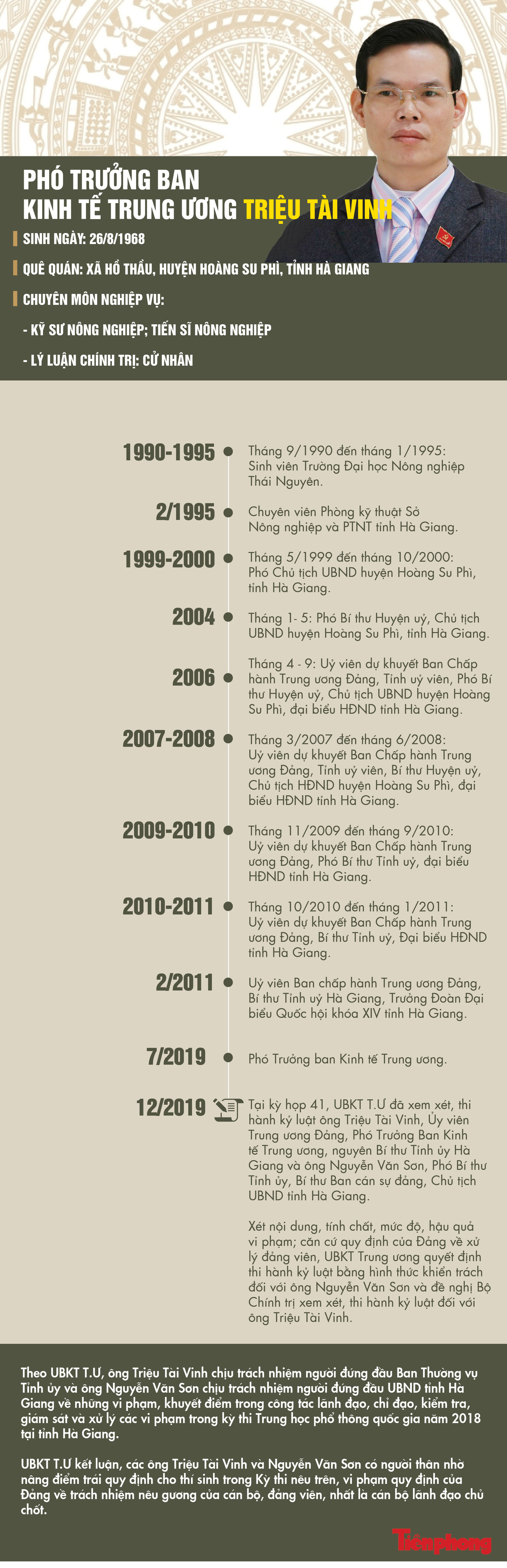 TPO - Liên quan vụ gian lận thi cử ở Hà Giang năm 2018, do để người thân nhờ nâng điểm trái quy định cho con, ông Triệu Tài Vinh, nguyên Bí thư Tỉnh ủy, bị kết luận vi phạm quy định của Đảng về trách nhiệm nêu gương và bị UBKT T.Ư đề nghị Bộ Chính trị kỷ luật.