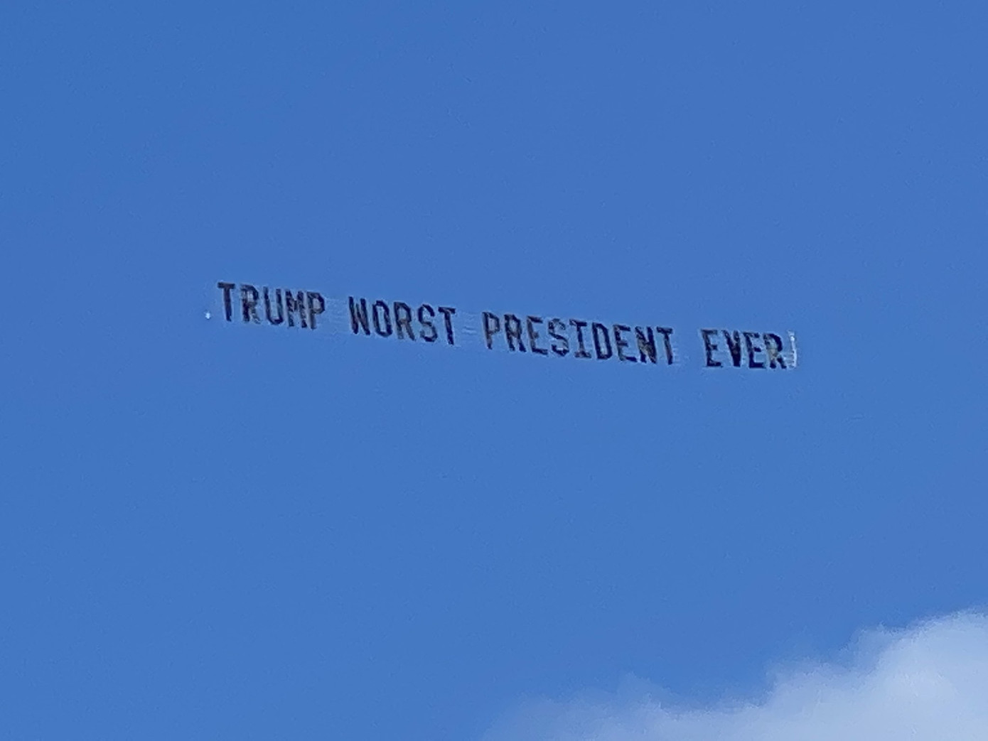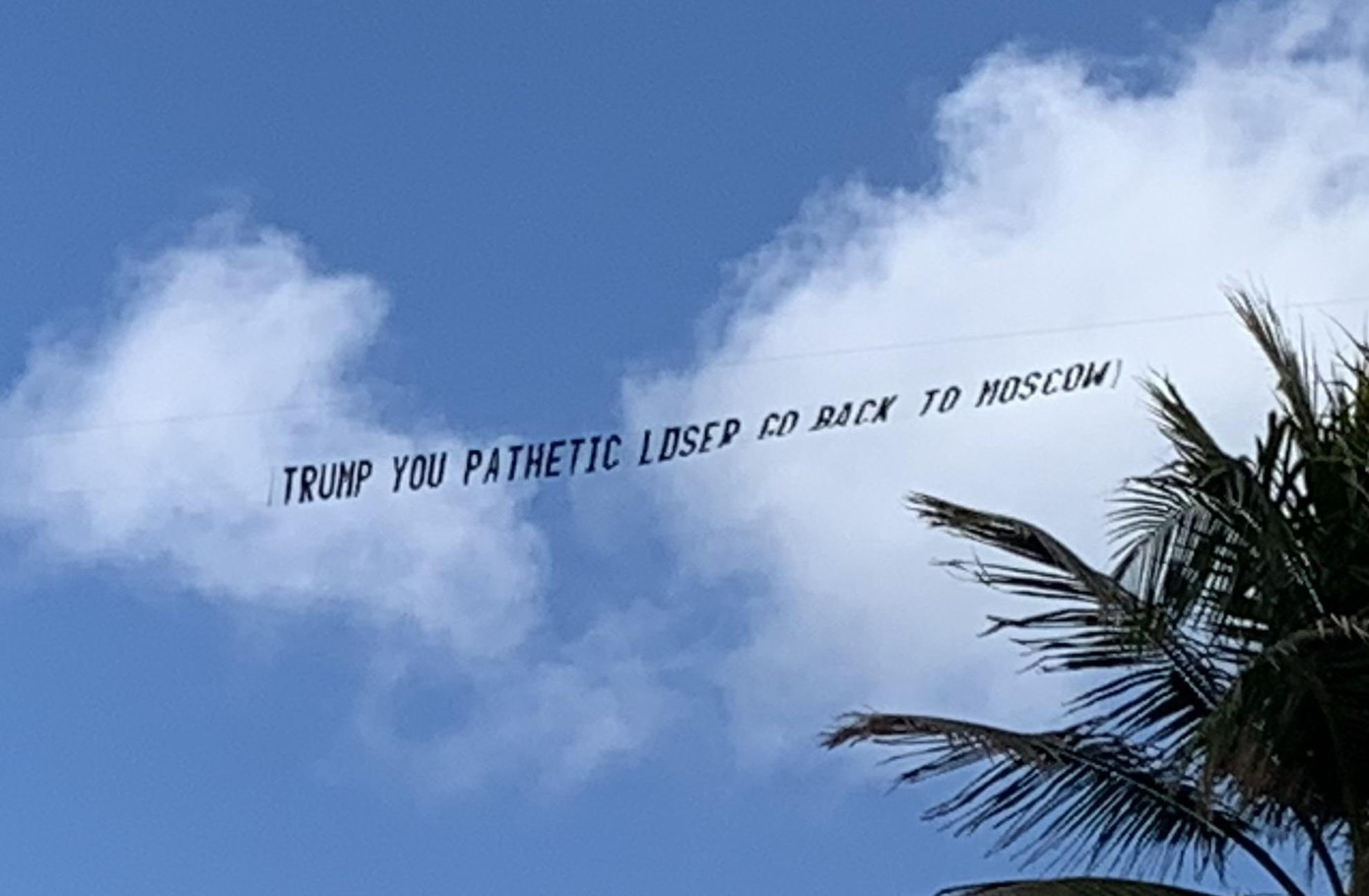 Các biểu ngữ với dòng chữ chế giễu ông Trump là "Tổng thống tồi tệ nhất từ trước đến nay", "kẻ thất bại thảm hại" được kéo sau một chiếc máy bay và liên tục bay qua phía trên của tư dinh của vị cựu tổng thống này.
