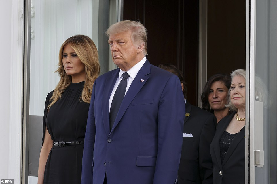 Đứng sau Tổng thống Trump, vợ ông Robert - bà Ann Marie Pallan Trump (55 tuổi, thứ 2 từ phải sang) không kìm nổi nước mắt. Ông Robert mới tái hôn với bà Ann Marie hồi tháng Ba.