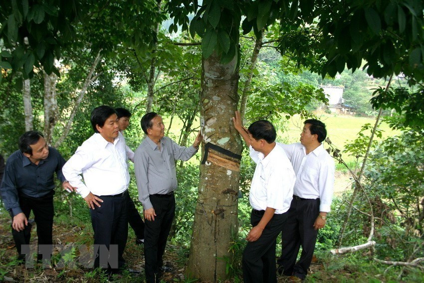 Phó Thủ tướng Trương Vĩnh Trọng thăm vườn cây cao su ở xã Hoang Thèn (huyện Phong Thổ) trong chuyến thăm, làm việc tại tỉnh Lai Châu từ ngày 13-15/10/2007. (Ảnh: Mạnh Hà/TTXVN)