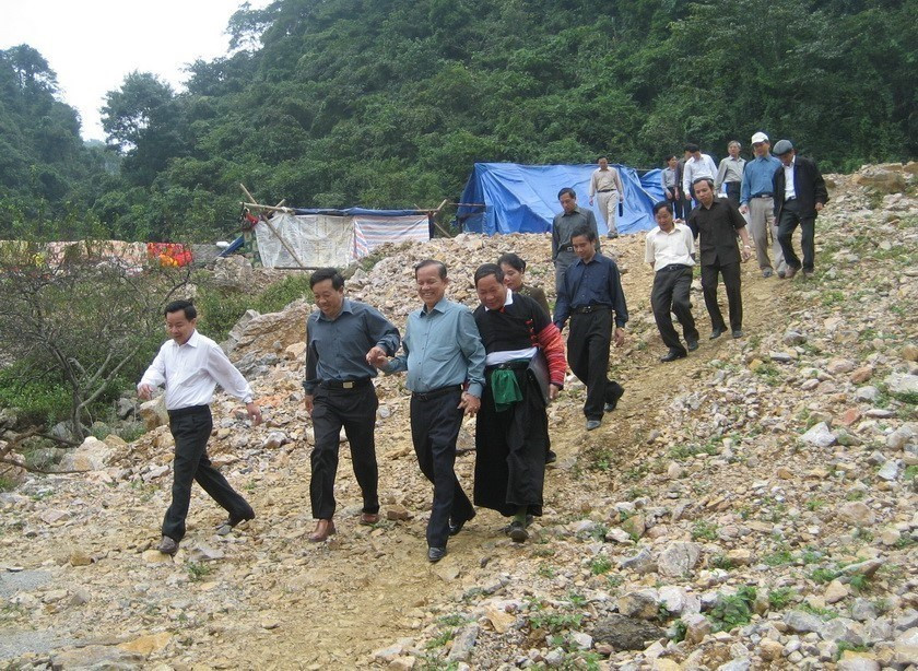 Phó Thủ tướng Trương Vĩnh Trọng đi thị sát tình hình khắc phục hậu quả cơn bão số 5 tại xã Lóng Luông, huyện Mộc Châu (tỉnh Sơn La), ngày 19/10/2007. (Ảnh: Nguyễn Hà Ngọc/TTXVN)