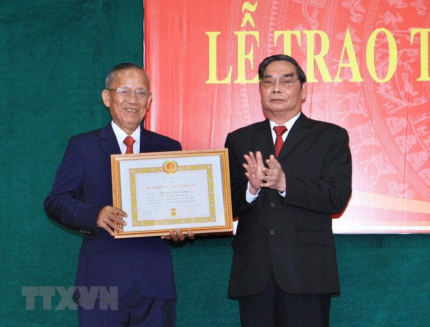 Ông Lê Hồng Anh, Ủy viên Bộ Chính trị, Thường trực Ban Bí thư trao Huy hiệu 50 năm tuổi Đảng cho ông Trương Vĩnh Trọng, ngày 16/7/2015, tại Hà Nội. (Ảnh: Doãn Tấn/TTXVN)