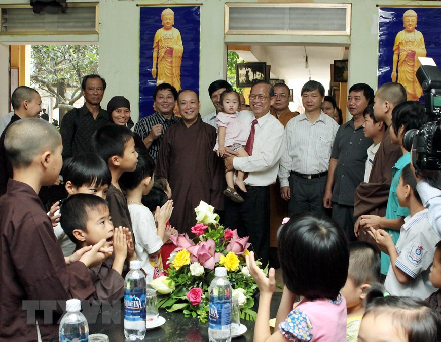 Nhân Ngày Quốc tế Thiếu nhi (1/6), sáng 26/5/2011, Phó Thủ tướng Trương Vĩnh Trọng đến thăm, tặng quà cho trẻ em nhiễm HIV/AIDS và chịu ảnh hưởng bởi HIV, được chăm sóc, giáo dục tại chùa Bồ Đề, quận Long Biên (Hà Nội). (Ảnh: Dương Ngọc/TTXVN)