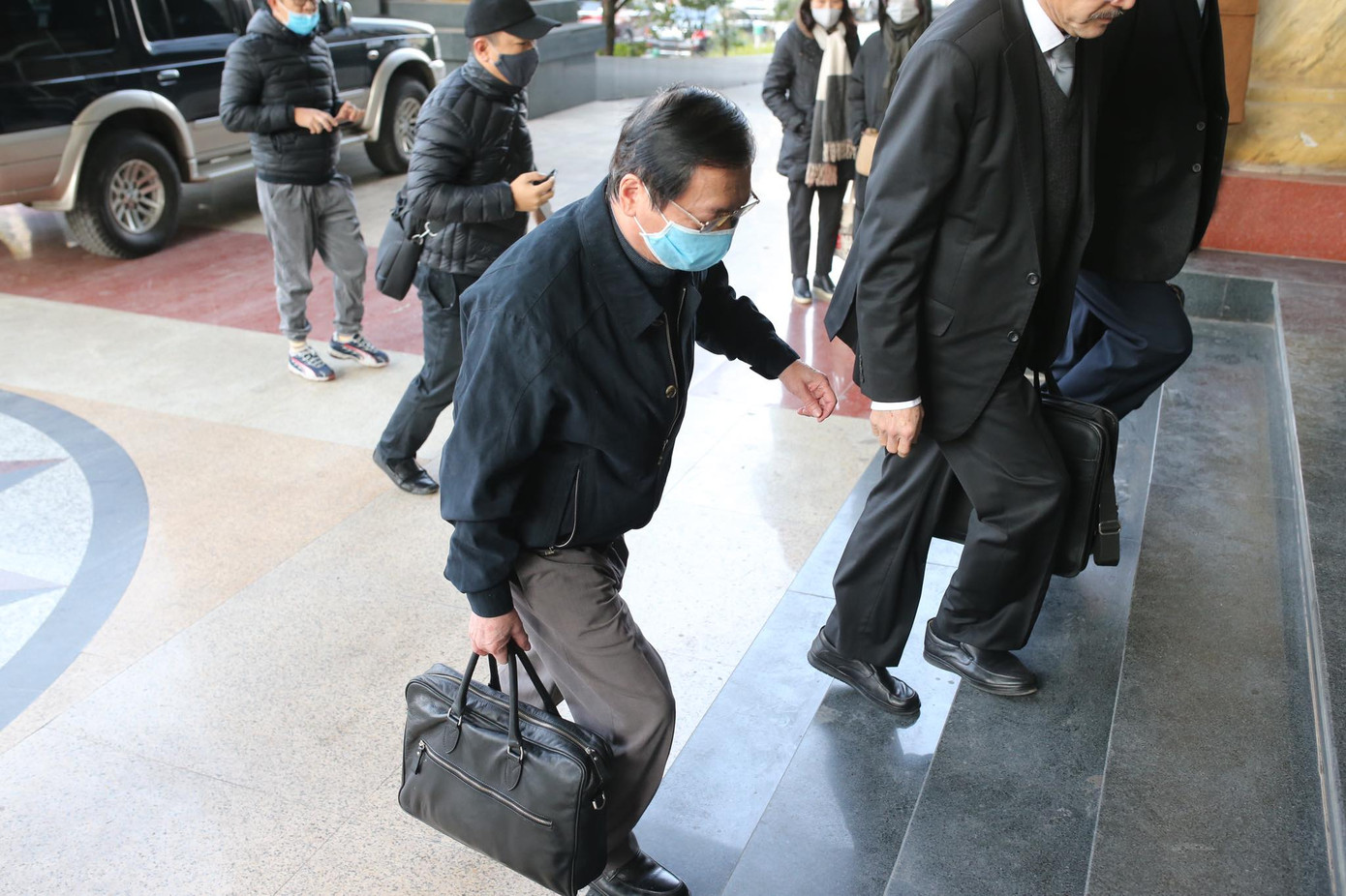Bị cáo Vũ Huy Hoàng được tại ngoại,đến tòa bằng ô tô cá nhân. Chủ tọa thông báo, Bị cáo Nguyễn Hữu Tín bệnh nặng không di chuyển được và có đơn xin xét xử vắng mặt. Ngoài ra, một số người có quyền lợi nghĩa vụ liên quan khác vũng vắng mặt. Chủ tọa thông báo thêm, thẩm phán Chử Phương Ngọc được phân công cùng xét xử vụ án này đã bị ốm nên ông Vũ Quang Huy - phán dự khuyết sẽ thay vai trò của bà Ngọc.