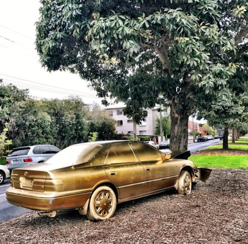 Chiếc Toyota Camry đã bị đánh cắp và bất ngờ đâm vào một gốc cây từ vài tuần trước trên đường phố Melbourne, Australia. Chiếc xe trong tình cảnh bị bỏ hoang thời gian dài, cho đến khi nó bất ngờ được nghệ sĩ đường phố ẩn danh phủ lên một lớp sơn vàng óng.