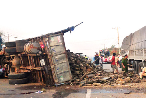 Xe chở gỗ lật nghiêng sau cú húc mạnh của xe tải. Ảnh: Nguyệt Triều