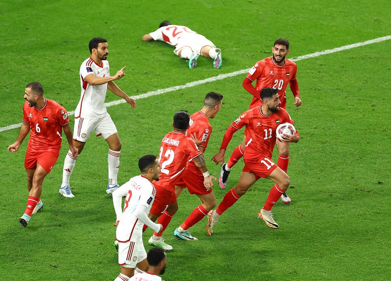 Nhưng 12 phút sau, Palestine đã mở ra hy vọng. Oday Dabbagh xâm nhập vòng cấm và bị ngã trong pha tranh chấp với cầu thủ UAE. VAR can thiệp và kết quả là penalty cho Palestine và cả thẻ đỏ cho UAE.
