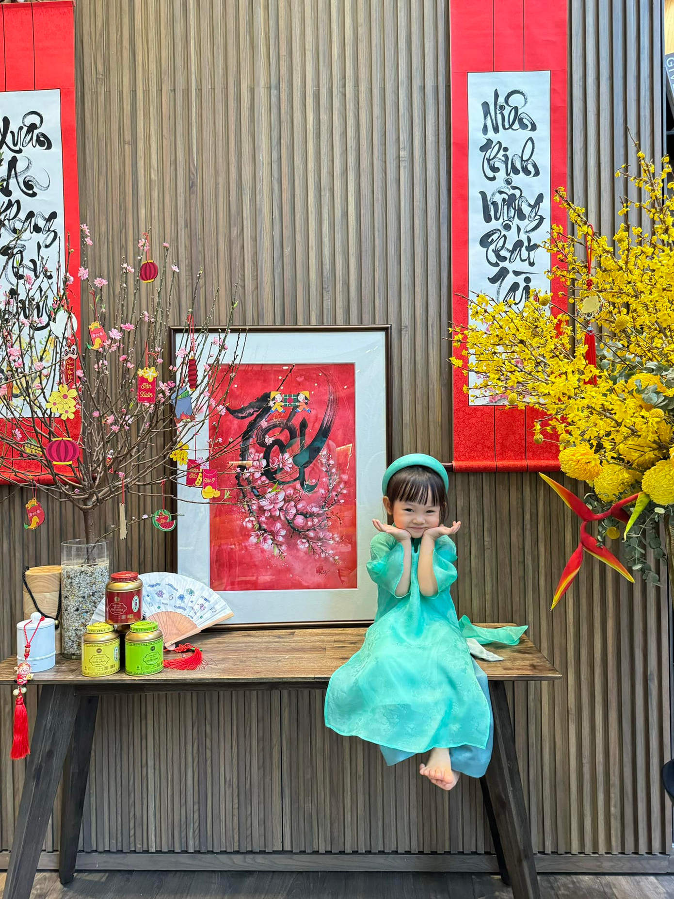 | Suchin xúng xính áo dài Tết cùng mẹ. |