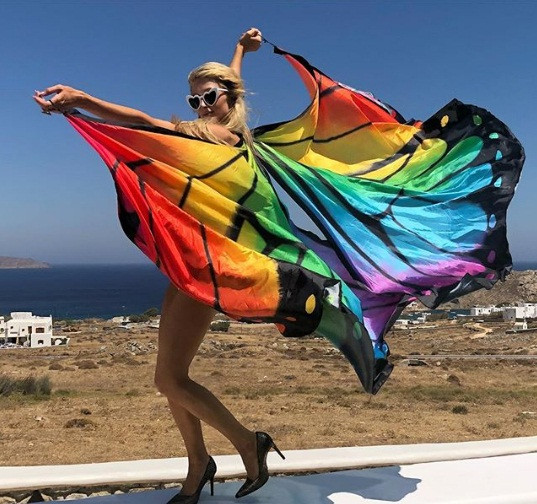 Ngôi sao đình đám diện áo tắm, đeo kính trái tim, giày cao gót và tạo dáng với áo choàng hình bướm.