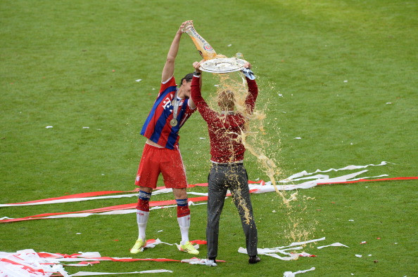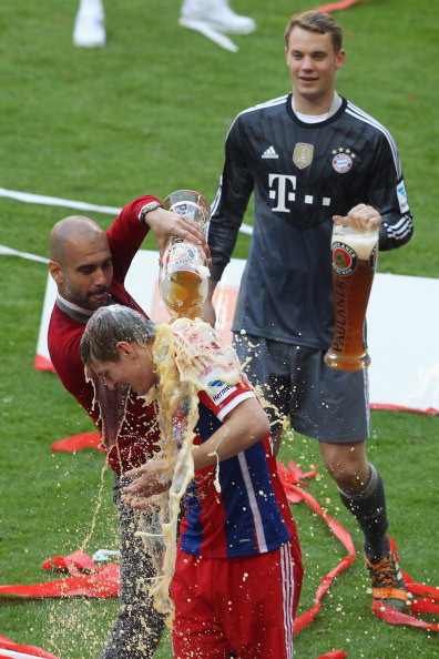 Sau chiến thắng 1-0 trên sân nhà trước Stuttgart, Bayern tổ chức buổi ăn mừng truyền thống. Đây là trải nghiệm đăng quang tắm bia đầu tiên của Pep Guardiola. Các học trò lần lượt hất cả vại bia vào nhà cầm quân người Tây Ban Nha khi ông đang giơ cao chiếc đĩa bạc.