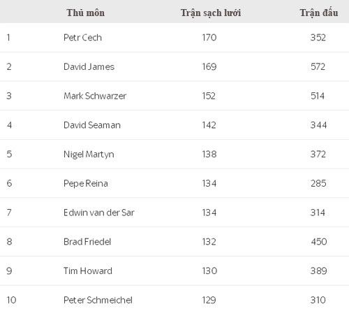Trong top 10 thủ môn có số trận giữ sạch lưới nhiều nhất Ngoại hạng Anh chỉ còn Mark Schwarzer, Pepe Reina và Tim Howard còn thi đấu. Tuy nhiên, cả ba đều khó vượt qua được thành tích của Cech.