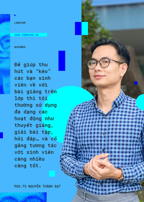 PGS.TS Nguyễn Thành Đạt: Có thể nói rằng hiện nay với sự phát triển của Internet và các thiết bị thông minh, các bạn sinh viên rất dễ bị phân tán cho việc học tập trên lớp. Đặc biệt gần đây, sự phát triển của các sản phẩm truyền thông ngắn là minh chứng cho việc dường như công chúng không thích việc phải quá tập trung trong một thời gian dài. Để giúp thu hút và “kéo” các bạn sinh viên về với bài giảng trên lớp thì tôi thường sử dụng đa dạng các hoạt động như thuyết giảng, giải bài tập, hỏi đáp… và cố gắng tương tác với sinh viên càng nhiều càng tốt. Việc này cũng giúp bản thân cảm thấy hứng thú hơn với việc giảng dạy của cá nhân tôi.