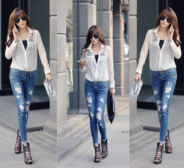 Nếu bạn là một cô nàng cá tính, hãy lựa chọn một chiếc quần jeans rách kết hợp với một đôi cao gót cao cổ như thế này.