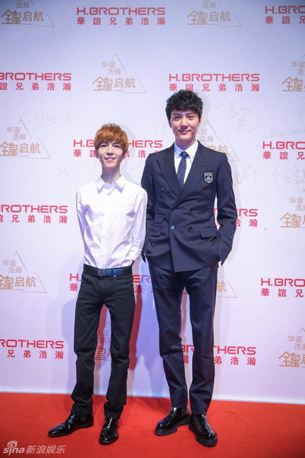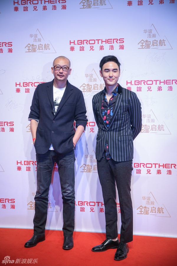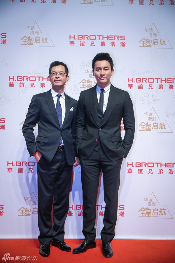 Dàn nghệ sĩ chụp ảnh cùng hai ông chủ của Hoa Nghị Huynh đệ. Theo Sina, Đỗ Thuần, Trịnh Khải, Lý Thần, Angelababy, Phùng Thiệu Phong, Trần Hách là 6 cổ đông mới của tập đoàn này.
