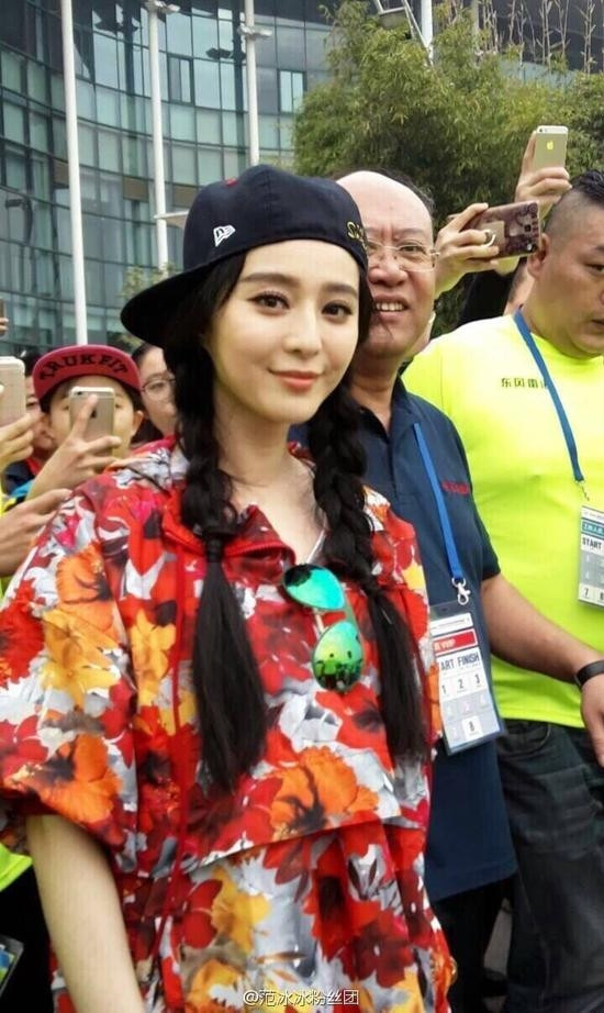 Tham gia buổi chạy mở màn cho cuộc thi, Phạm Băng Băng lựa chọn mặc chiếc áo hoa thụng, tết tóc hai bên, đội mũ ngược cùng gương mặt trang điểm kĩ lưỡng.