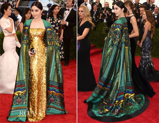 Mỹ nhân Trung Quốc tại sự kiện Met Gala 2015. Bộ váy dáng cape lấp lánh ánh vàng là của Christopher Bu.