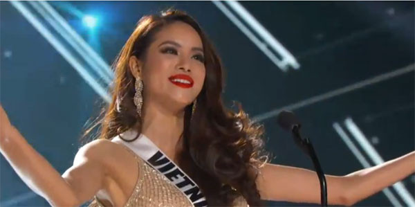 Phạm Hương trình diễn cuối cùng trên sân khấu theo thứ tự ABC. Cô sải bước tự tin, luôn nở nụ cười rạng rỡ tràn đầy năng lượng. Đại diện Việt Nam cũng nhận được nhiều tràng pháo tay ủng hộ của khán giả có mặt ở sân khấu.