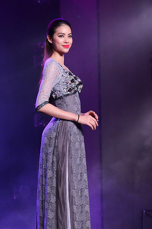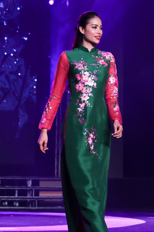 Bộ áo dài thứ hai Phạm Hương thể hiện có cách tân ở cổ và tay áo, giúp tôn nét gợi cảm của người mặc. Phạm Hương làm chủ sân khấu thời trang bằng thần thái tự tin.