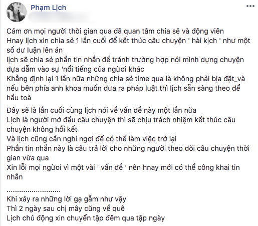 Mới đây nhất, trên trang cá nhân, Phạm Lịch đã công khai đoạn tin nhắn trên zalo giữa cô và một tài khoản có tên "Chị Mây Vợ Anh Khoa", được Phạm Lịch chia sẻ là Thùy Trang, vợ nam ca sĩ về những vấn đề cô không hài lòng về Phạm Anh Khoa trước khi công khai tố cáo nam ca sĩ gạ tình.
