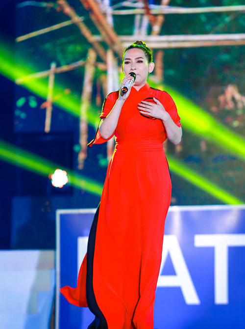 Phi Nhung cũng nổi bật với áo dài đỏ rực, khoe giọng hát ngọt ngào, truyền cảm.