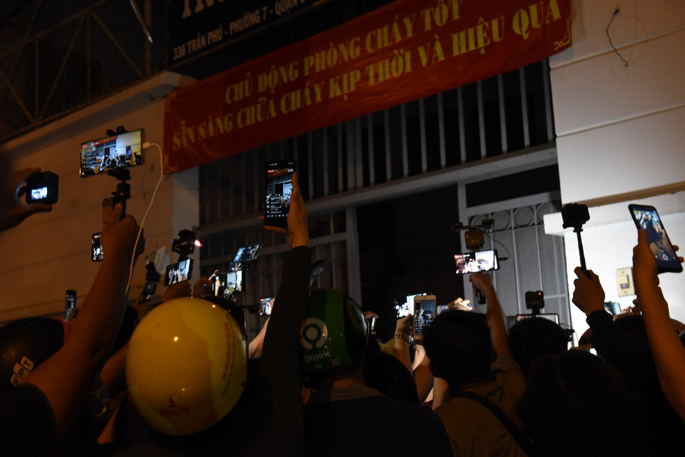 Hàng trăm máy quay liên tục livestream trực tiếp tại hiện trường. (Ảnh: Duyên Phan) Các YouTuber trang bị đầy đủ các thiết bị hỗ trợ như điện thoại, sạc pin dự phòng, đèn… chen lấn, xô đẩy nhau để ghi hình. Lực lượng chức năng khá vất vả khi vài tiếng đồng hồ túc trực nơi đây để dàn xếp, giải tán dòng xe đông đúc gây ùn tắc giao thông.