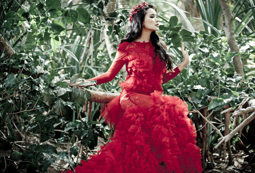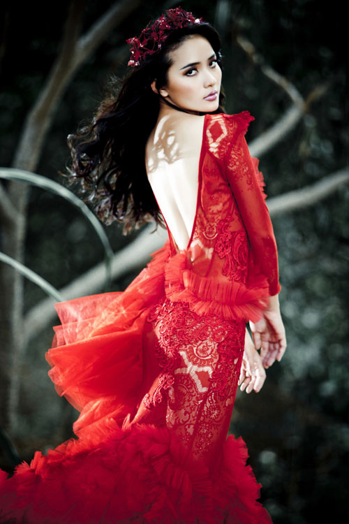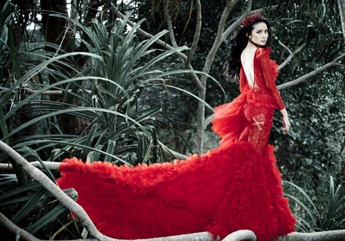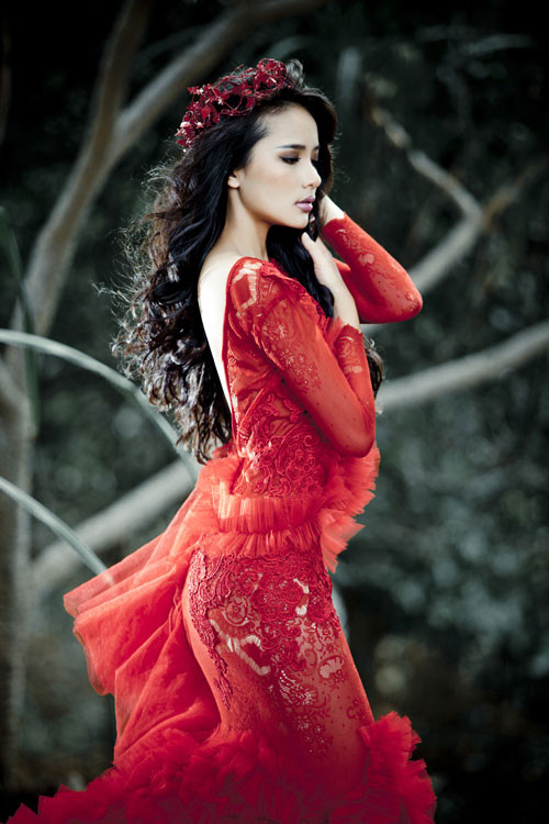 Người mẫu nổi bật với bộ váy đỏ rực dáng đuôi cá của nhà thiết kế Thái Nguyễn.