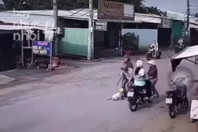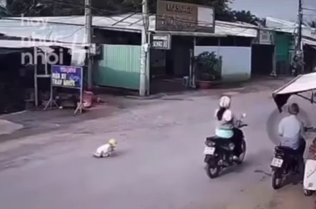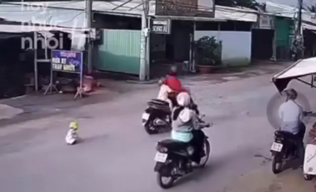 Sau đó, người phụ nữ này bỏ một bé nhỏ xuống rồi thản nhiên chạy xe máy bỏ đi, mặc cho đứa bé bò qua đường trong lúc có nhiều xe máy qua lại. Người dân đi đường vội ẵm cháu bé vào lề.